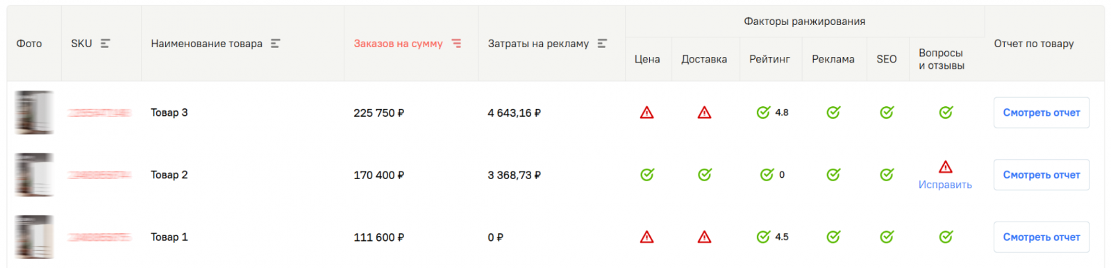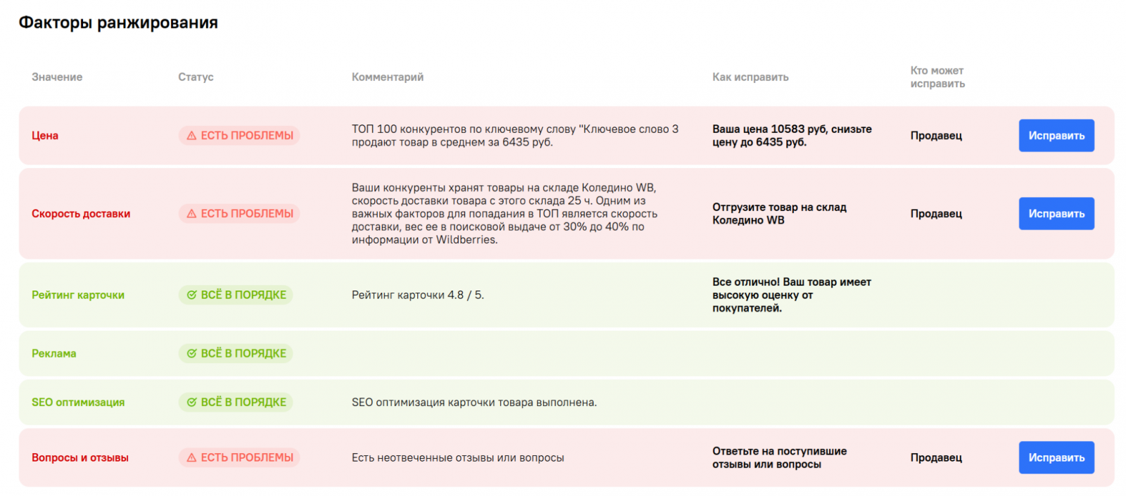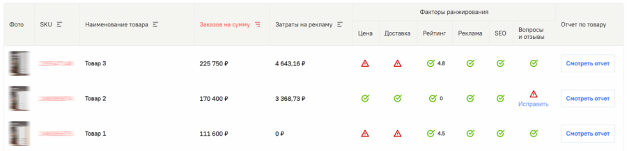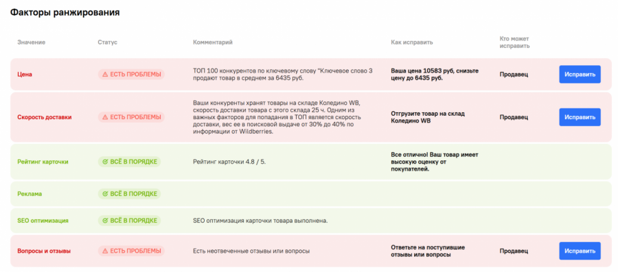 Актуальный статус об отзывах на конкретный товар доступен в отчете с детальной статистикой о продажах, остатках на складе, динамике спроса и так далее. Также в нем отображаются рекомендации в виде готовых заданий по улучшению карточек, цен и логистики.
