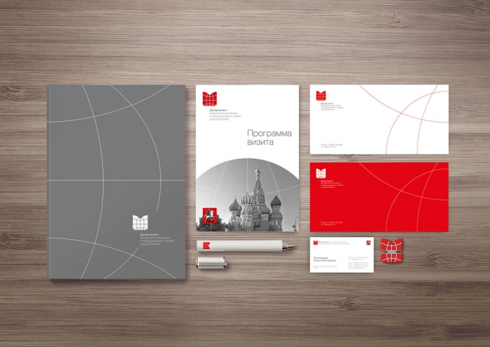 Одним из условий задания, сформулированных Департаментом, было представление в фирменном стиле графического образа земного шара, а также использование одного из узнаваемых символов Москвы. После презентации вариантов, была согласована концепция «Москва в мире. Мир в Москве», в которой мы объединили основные направления деятельности Департамента, связанные с формированием имиджа Москвы как на международном уровне, так и внутри страны.