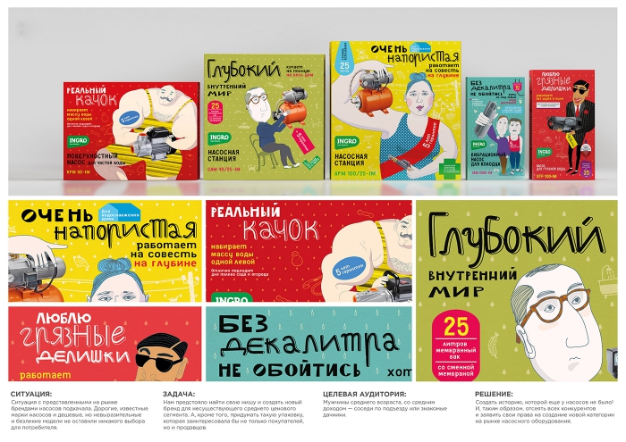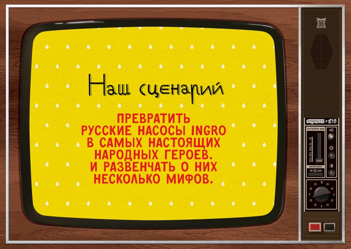 "Мы создали ярких как все соседи, персонажей, близких и понятных всем. Напористая русская женщина, на которой весь дом держится. Веселые приятели, которые без декалитра точно ни в чем не разберутся. Скользкий тип с грязными делишками и чистыми намерениями. Так мы превратили бездушные машины в "своих ребят" и не подкачали. Насосы Ingro «заговорили» с продавцами и покупателями на одном языке", - рассказали авторы проекта.