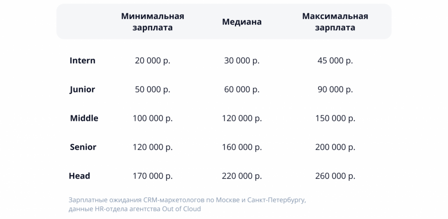 CRM-маркетолог — одна из самых дорогих позиций в сфере маркетинга. Средняя зарплата специалиста уровня junior — 50−95 тыс. руб. Разброс большой, потому что требования к младшему сотруднику различаются: где-то специалист самостоятельно ведет проекты, а где-то только помогает старшим специалистам. В систему мотивации сотрудников компании вшивают достижение маркетинговых целей, учитывают фактическую выработку и навыки, которыми обладает сотрудник.