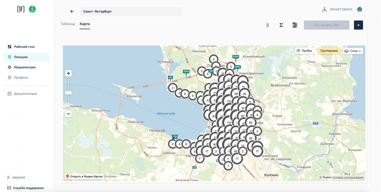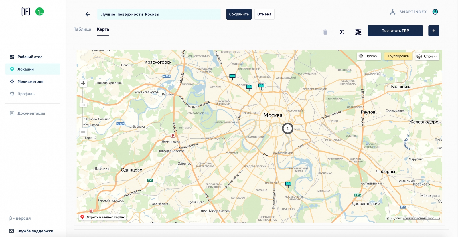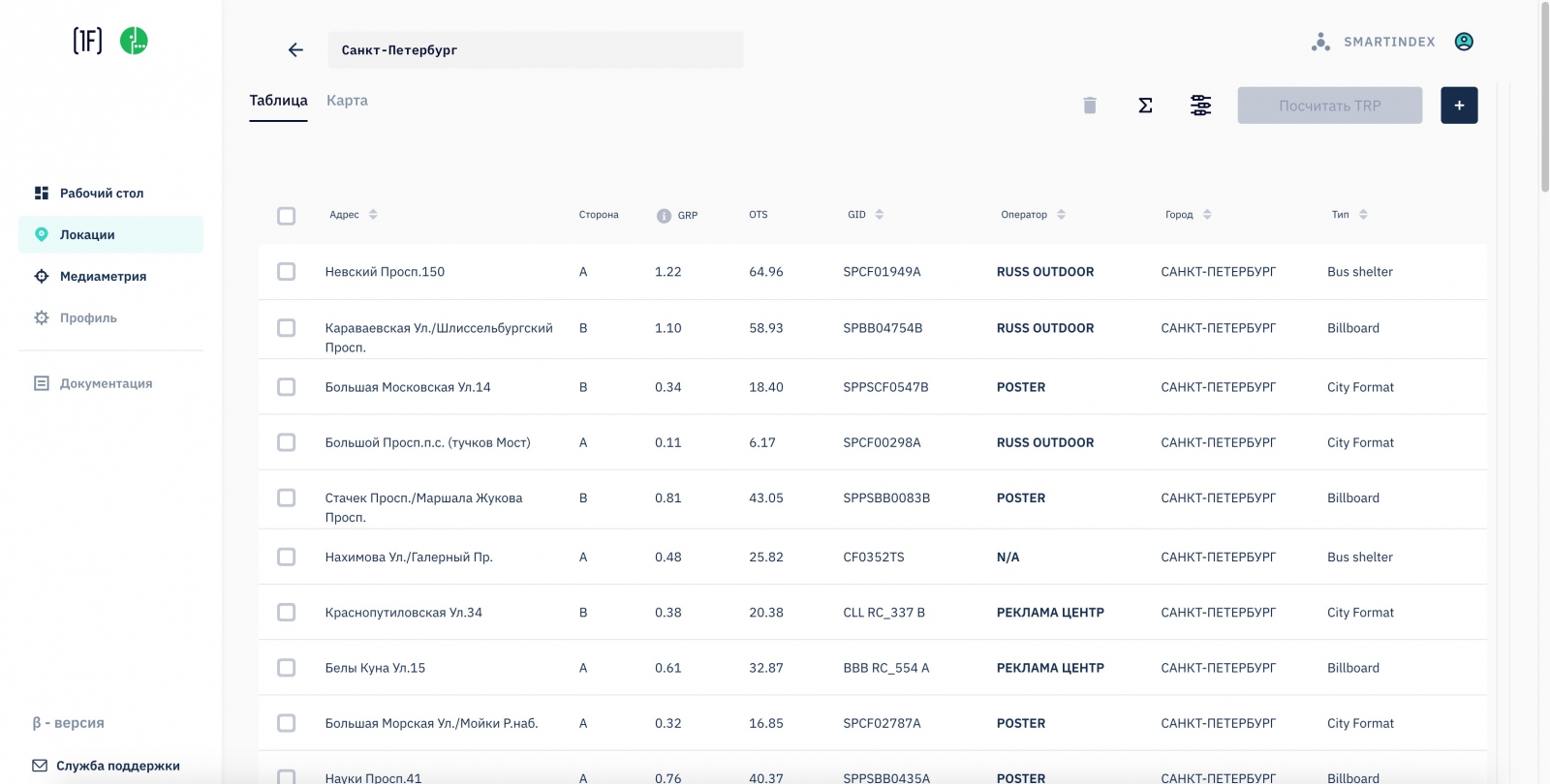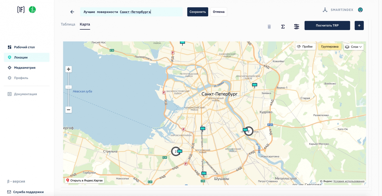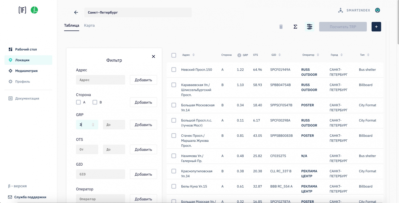Чтобы измерить таргетированные показатели, oneFactor загрузили рекламные поверхности Москвы и Санкт-Петербурга с помощью web-интерфейса SmartIndex 2.0. После этого был установлен нижний порог GRP для билбордов и суперсайтов.