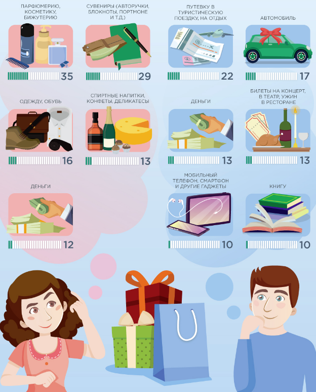 Рейтинг предпочтительных подарков открывает путевка на отдых (22%). Но тут проблема: ее собираются подарить только 1% женщин. 17% респондентов-мужчин мечтают об автомобиле. Зря. В списке планирумых подарков в строчке автомобиль стоит «ноль%». 13% мужчин более реалистичны — они хотели бы получить билеты на концерт, в театр или ужин в ресторане. И действительно, 8% женщин готовы сделать это. Каждый десятый мечтает о смартфоне или другом гаджете, однако только 7% опрошенных женщин планируют это подарить. 10% респондентов знают жизнь и хотят в подарок… книгу. И 8% женщин именно это и планирут сделать.