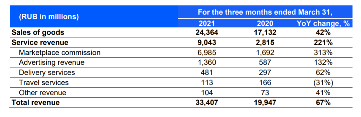 Оборот от продаж (GMV) товаров и услуг вырос на 135% в годовом выражении и достиг 74,2 млрд руб. Выручка от услуг составила 9 млрд руб., что на 221% больше, чем годом ранее.