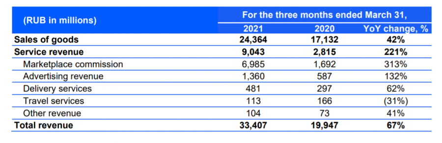 В выручку от продажи услуг входят следующие показатели: комиссия от продавцов маркетплейса — 7 млрд руб. (+313%), выручка от рекламы — 1,4 млрд руб. (+132%), доставка — 481 млн руб. (+62%), путешествия — 113 млн руб. (-31%) и другие доходы, которые выросли на 41%, до 104 млн руб.