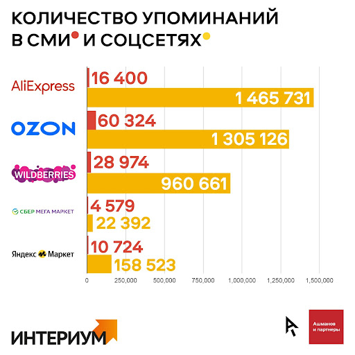 Агентство диджитал-маркетинга «Ашманов и партнёры» совместно с диджитал-агентством «Интериум» составили репутационный рейтинг для пяти крупнейших российских маркетплейсов. Специалисты оценили состояние репутации по ряду параметров: количеству и тональности упоминаний в СМИ и соцсетях, тональности выдачи в поисковых системах, качеству коммуникации на страницах маркетплейсов в социальных медиа.
