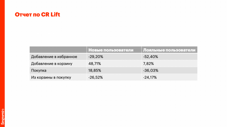 Например, конверсия из просмотра в добавление в корзину для новых пользователей бренда на 48,71% выше по отношению к пользователям без атрибуции. При этом CR Lift по конверсии из просмотра в покупку для новых пользователей выше на 18,85% по сравнению с пользователями без атрибуции.