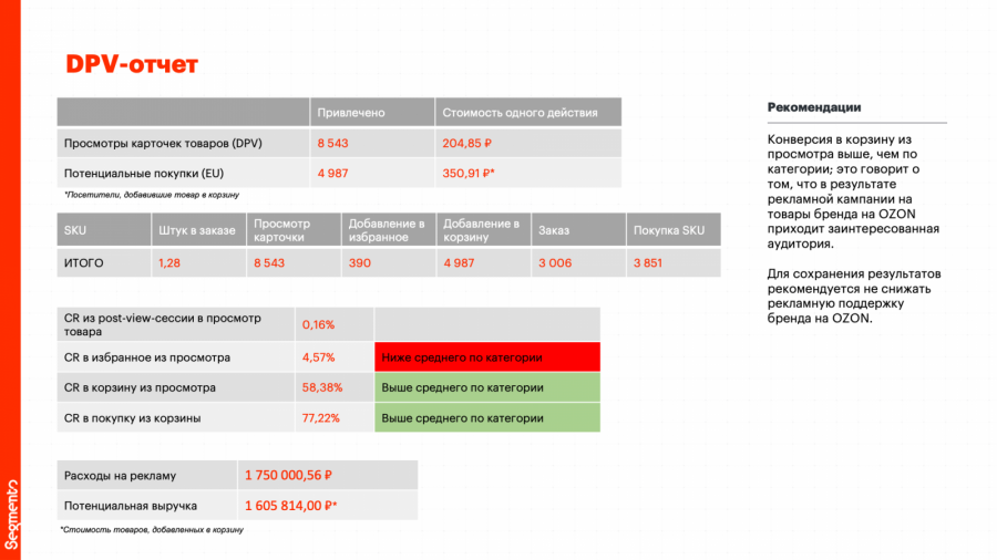 DPV-отчет (Detailed Page View) расскажет о стоимости просмотра карточки товара. Это данные о цене привлечения одного пользователя на каждую из товарных позиций, а также о стоимости потенциальной покупки, иными словами, о цене целевого действия «добавление в корзину». Этот отчет позволит сопоставить реальную выручку с потенциальной выручкой от клиентов, привлеченных рекламной кампанией. Кроме того, на основе данных Ozon Segmento покажет эффективность конверсии относительно средних показателей по той или иной категории товаров. Рекомендации на основе этих данных позволят повысить эффективность последующих кампаний.