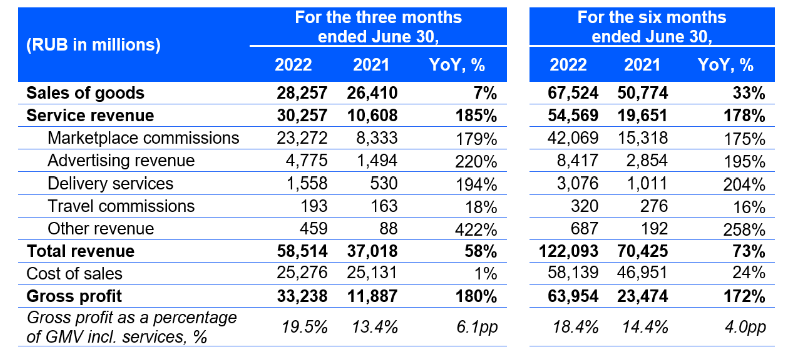 По итогам первых шести месяцев выручка Ozon увеличилась на 73%, до 122 млрд руб., по итогам второго квартала — на 58% год к году, до 58,5 млрд руб. Скорректированная EBITDA составила 0,2 млрд руб. во втором квартале против -9,1 млрд руб. в аналогичном периоде 2021 года. Ozon впервые вышел на операционную безубыточность.