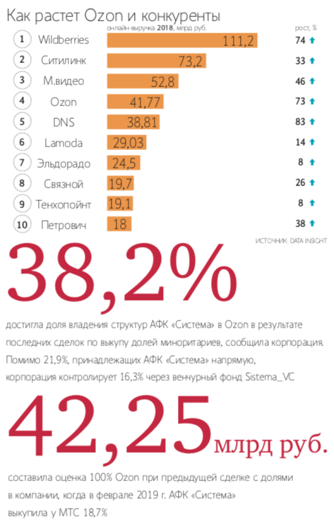 «Системе» принадлежит 38,2% Ozon, а структурам Baring Vostok- 39,16%. Акционеры верят, что Ozon сможет стать лидером российского рынка электронной коммерции.