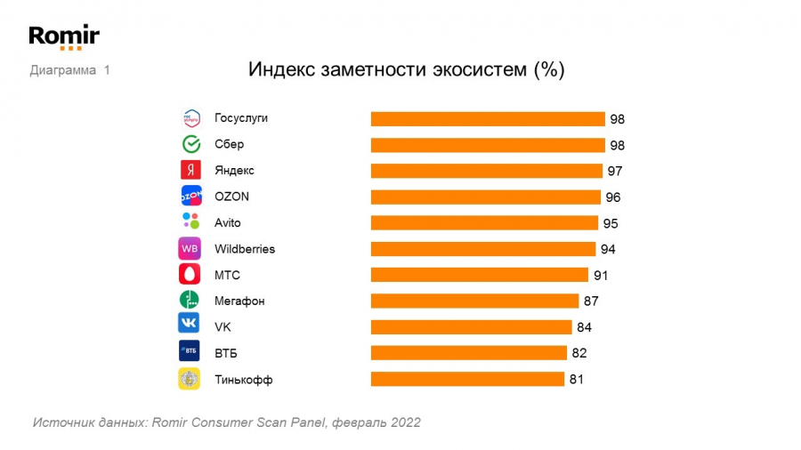 - Индекс заметности — отражает долю россиян, знакомых с экосистемой.