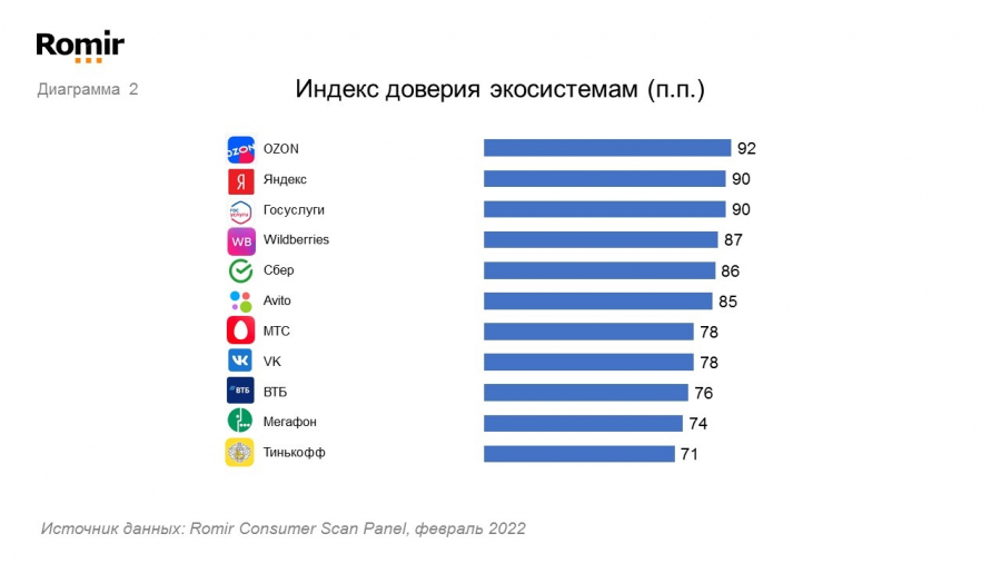 - Индекс доверия — рассчитывается как разница между долями респондентов, положительно и отрицательно относящихся к конкретной экосистеме.
