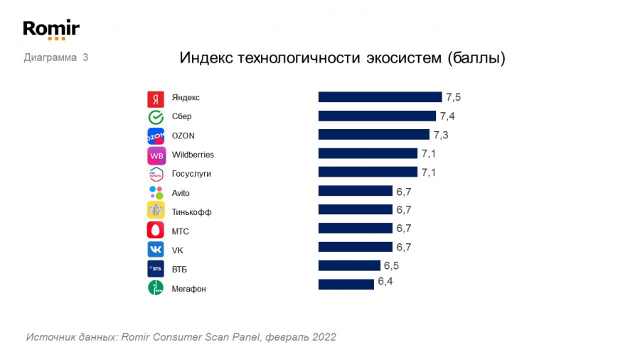 Самой технологичной экосистемой россияне считают «Яндекс» (7,5 из 10 баллов), далее «Сбер» (7,4 балла) и Ozon (7,3 балла).
