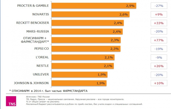 Вторую и третью позицию в рейтинге занимают Novartis и Reckitt Benckiser, которые весь минувший год спорили с P&G за первенство по рекламным тратам. Обе компании нарастили бюджеты в 2015 году: на 9% и 33%, соответственно. Также в пятерку крупнейших рекламодателей России вошли Mars, снизивший бюджеты на 20%, и еще один производитель лекарств "Отисифарм" ("Фармстандарт"), увеличивший траты на рекламу на 77%.
