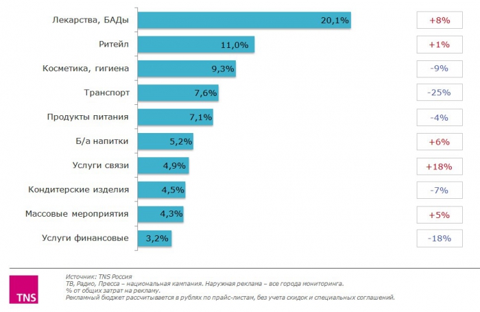 Среди товарных категорий лидерство удерживает "фарма": на производителей лекарств и БАДов приходится свыше 20% всех рекламных трат на российском рынке. За 2015 год данная категория не только не сократила, но и увеличила траты на рекламу на 8%.