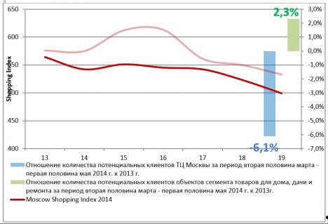 На некоторых неделях падение составило в среднем 10 пунктов (14 и 15-я недели), что объясняется размытием потока в связи с вводом новых площадей на рынке, ухудшением экономической ситуации, внешнеполитическими факторами, которые влияют на покупательное поведение (украинские события, санкции Запада), вызывая обеспокоенность населения и нежелание тратить деньги. Вместе с тем, торговые центры начинают жестче конкурировать в борьбе за покупателя, выстраивая долгосрочные маркетинговые программы.