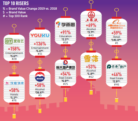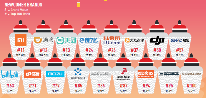 Среди новых брендов, которые только в этом году вошли в ТОП-10 самых дорогих брендов Китая, эксперты выделяют компанию Xiaomi, сервис заказа такси Didi Chuxing, а также онлайн-сервисы доставки еды Meituan и Ele.me.