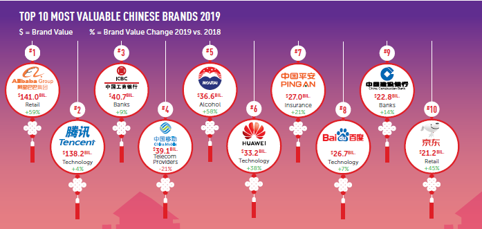 ТОП-10 самых дорогих китайских брендов ожидаемо возглавляет Alibaba, за ним следует Tencent и банк ICBC.