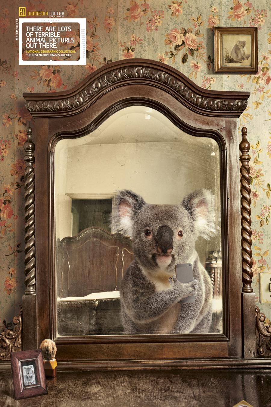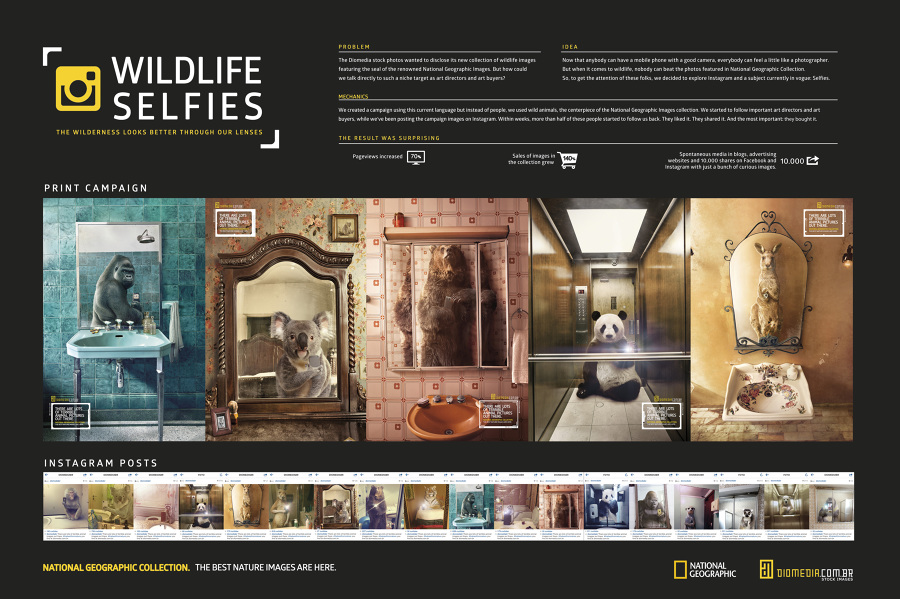 Бразильский фотосток Diomedia запустил кампанию в поддержку своей коллекции фотографий с животными. Сначала необычные снимки публиковались в Instagram, потом на их основе была создана серия принтов. Животные на фотографиях делают селфи, так как ничто человеческое им не чуждо.