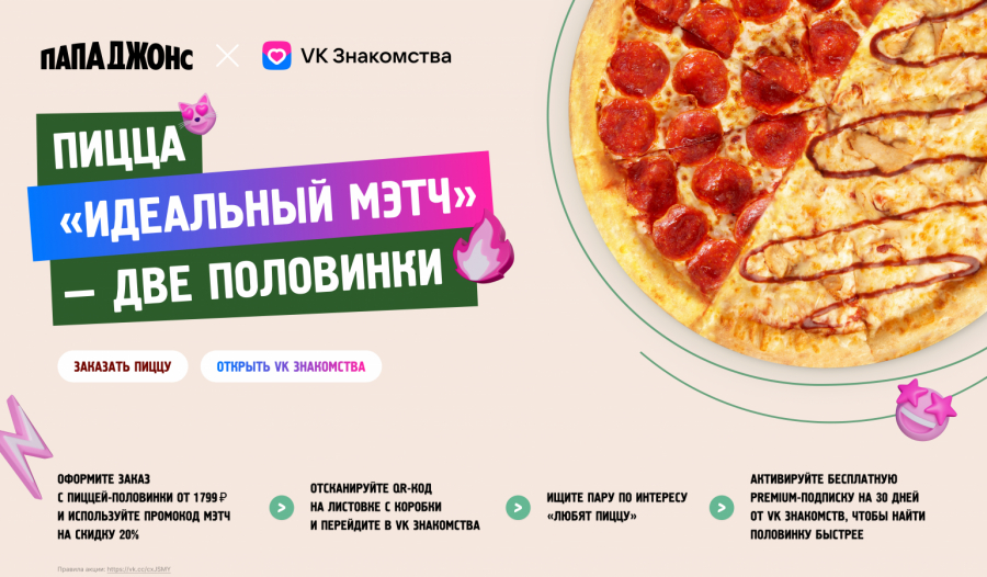 В период акции, с 20 июня по 25 июля 2024 года, пиццу «Половинки» можно было получить со скидкой 20% по промокоду «Мэтч» при заказе от 1 799 рублей. Клиенты, заказавшие «Половинки» 35 и 40 сантиметров, получали открытки с советами, с чего начать разговор о пицце, и рекомендациями от «VK Знакомств», как найти вторую половинку быстрее, следуя вкусовым предпочтениям. Кроме того, в открытке был QR-код с бесплатным доступом к Premium функциям дейтинг-сервиса на 30 дней.