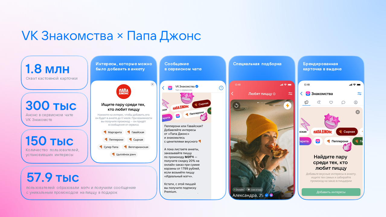 В приложении «VK Знакомства» брендированные карточки с интересами от «Папа Джонс» показали 1,8 миллиона раз. 150 тысяч пользователей установили кастомные интересы со вкусом любимой пиццы и образовали более 57,9 тысячи мэтчей.