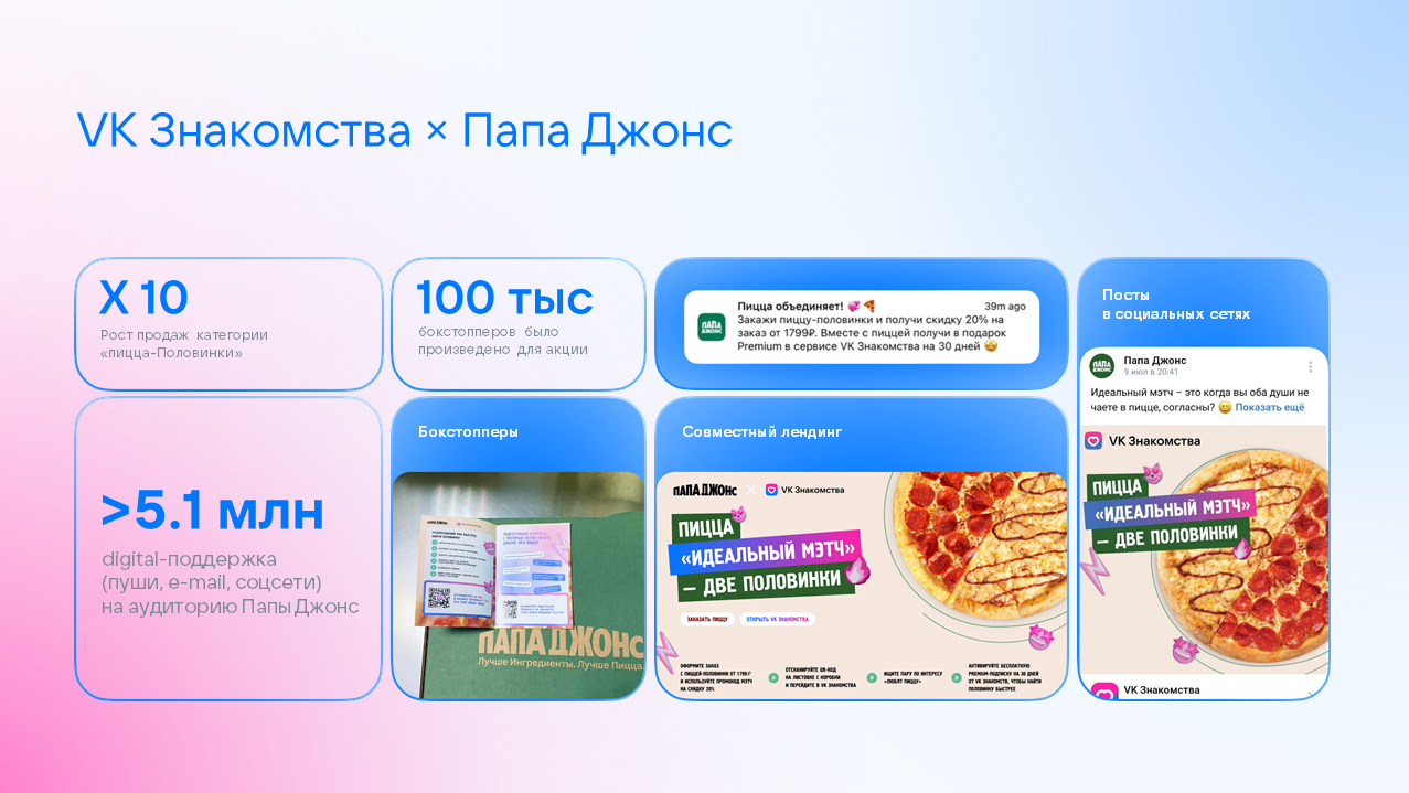 Кейс «Папа Джонс» и «VK Знакомств» — пример того, как с помощью дейтинг-сервиса можно креативно продвигать продукт, увеличивая узнаваемость бренда. Темы романтических свиданий и тематической еды, а именно пицц «Половинка», тесно переплетены друг с другом — подобные кампании способствуют качественному обмену аудиторией, росту продаж и вовлечённости.