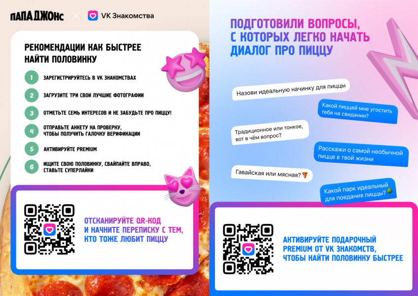 Идеальная пицца для романтических свиданий — какая она? Летом 2024 года сеть пиццерий «Папа Джонс» и дейтинг-сервис «VK Знакомства» попытались ответить на этот животрепещущий вопрос и запустили совместную кампанию. Она основывалась на предположении, что любовь к пицце способна объединять сердца людей и может стать поводом для начала общения.