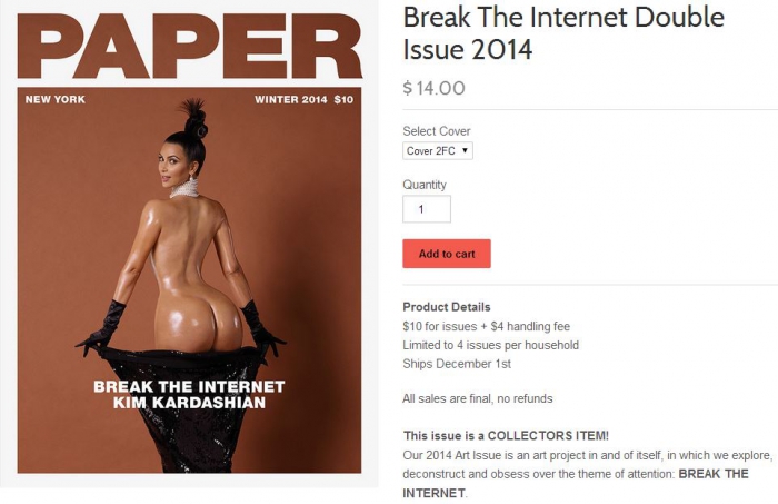 Автором снимков стал Жан-Поль Гуд. Paper попросило его воссоздать знаменитую фотографию «Случай с шампанским». Новый номер журнала стоит 14 долларов и отпускается в количестве не более 4 в одни руки. Редакция продвигает проект с хэштегом #breaktheinternet, фотография уже стала объектом для многочисленных пародий и подражаний.