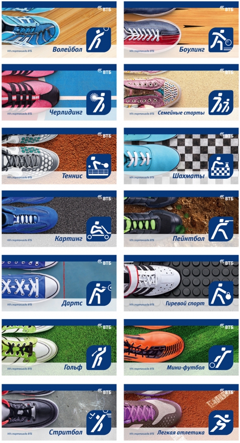 Для различных видов спорта была создана серия постеров, каждый со своей парой спортивной обуви и соответствующим покрытием. Специальная обувь нужна во всех видах соревнований, будь то картинг, пэйнтбол, дартс и даже шахматы. Именно кроссовок со шнуровкой стал узнаваемым элементов во всех видах спорта, говорят креаторы.