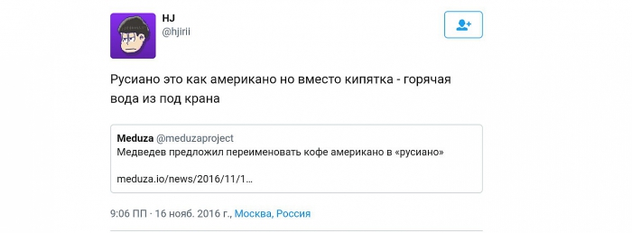 Новость о том, что премьер-министр Дмитрий Медведев предложил переименовать «неполиткорректный» американо, СМИ растиражировали с подачи РИА Новости. Агентство сообщило, что таким образом глава правительства пошутил на заседании Евразийского межправительственного совета. Позже выяснилось, что новое название - «русиано» - придумал не Медведев, а представитель армянской делегации.