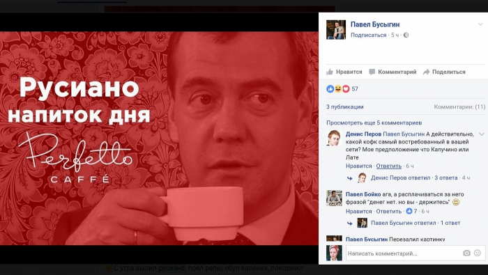 Тренд быстро подхватили предприниматели. В московском кафе «Лисья нора» появился “руссиано” (так в оригинале - прим. Sostav.ru) за 39 рублей, а екатеринбургский бар “Огонек” пошел дальше и составил меню “Премьер”. Теперь посетители заведения могут заказать стейк "Воронеж", виски “Жора Денисов” (Jack Daniels), коктейли “Саратовский лимонад”, “Кислая Пермь” и “Марьина роща”. Сегодня также и в Burger King появился кофе под названием "Руссиано".