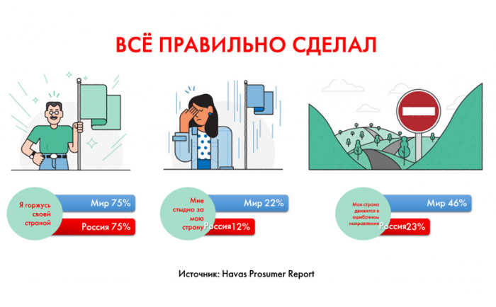 Большинство людей гордится своей страной, и в этом смысле Россия не отличается от мира. 75% про*требителей гордятся тем, что живут в своей стране. При этом, в отличие от мирового, российский про*требитель испытывает меньше стыда за свою страну (12% против 22%) и уверен, что страна движется в правильном направлении (23% против 46%).