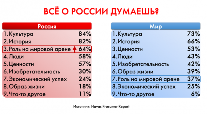 В целом россияне довольны своей страной, в особенности усилением роли России на мировой арене. Они видят силу российской культуры и не верят, что на нее может повлиять глобализация. Самые продвинутые российские потребители видят Россию страной с сильной политической волей и позицией.