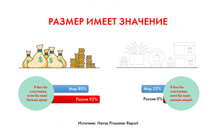 В отличие от новых мировых тенденций, российский про*требитель ищет счастья в материальном мире. Больше денег сделали бы счастливее 92% россиян (против 80% в среднем по миру). Новый мировой тренд Experience is new having, вдохновляющий людей искать счастье не в вещах, а жизненном опыте, совершенно не актуален даже для продвинутых российских потребителей.