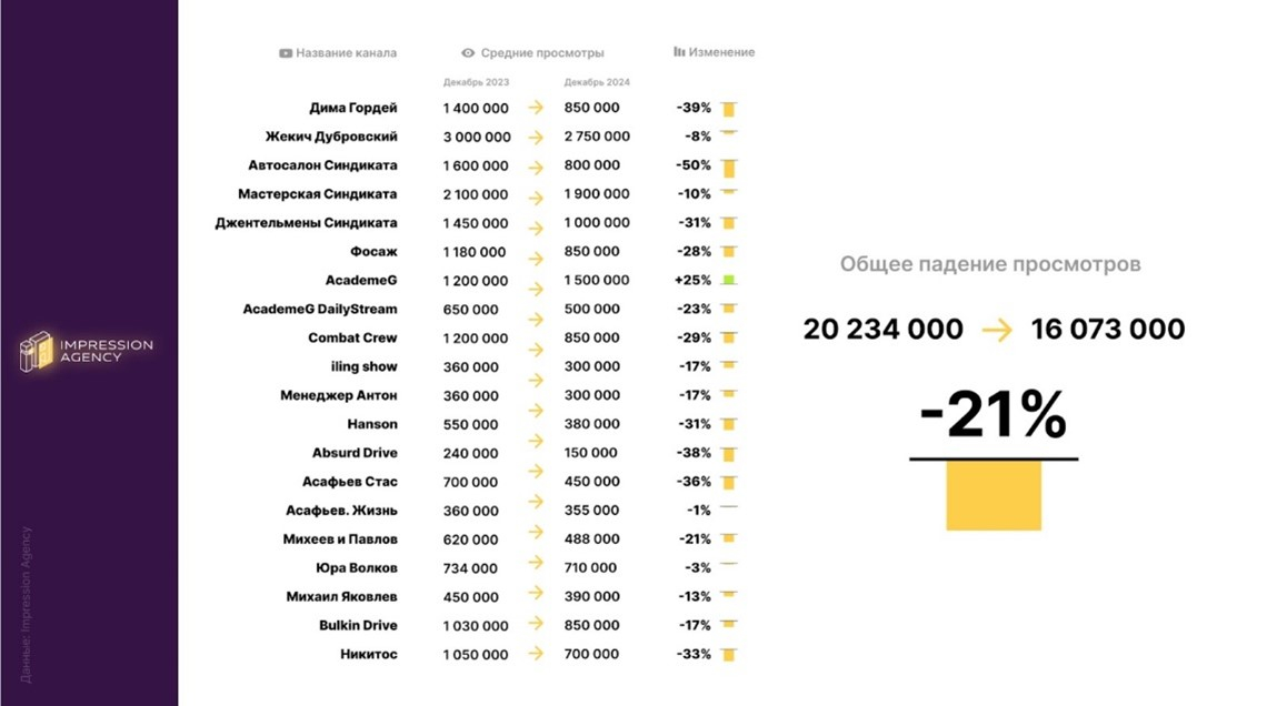 Impression Agency проанализировало 20 наиболее популярных каналов автоблогеров, которые собирают около 70% всех просмотров в данном сегменте. Это делает данные более чем репрезентативными. До замедления эти каналы в среднем генерировали около 20 млн просмотров на единицу контента. На сегодняшний день они собрали 16,1 млн просмотров. Таким образом, падение составило около 21% — неприятно, но не драматично.