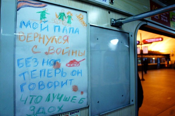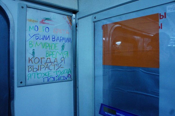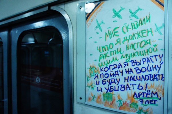 23 февраля в двух поездах первой линии питерского метро группа активистов расклеила плакаты антимилитаристского содержания, выполненные в стиле детских рисунков. Авторы акции прокомментировали свою инициативу в группе ВКонтакте: