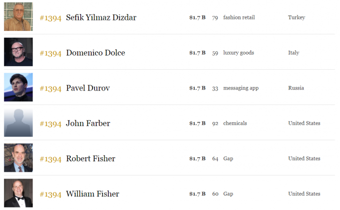 Дуров занял в рейтинге 1394-е место. Его состояние оценили в 1,7 миллиарда долларов. По данным журнала, Telegram стоит более одного миллиарда долларов.
