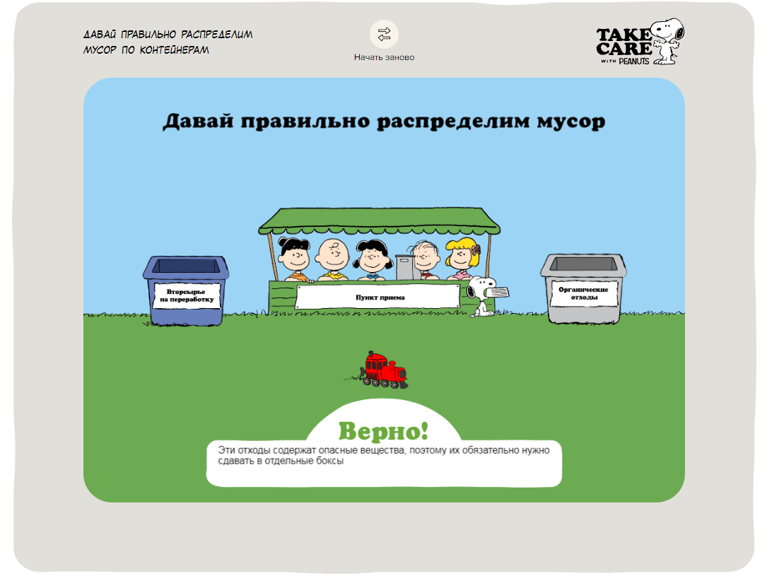 22 февраля в России был запущен образовательный онлайн-курс «Заботься о планете вместе с Peanuts», который в игровой форме показывает важность сохранения ресурсов планеты и развивает полезные привычки у детей. Над активацией работал представитель бренда комиксов Peanuts в России