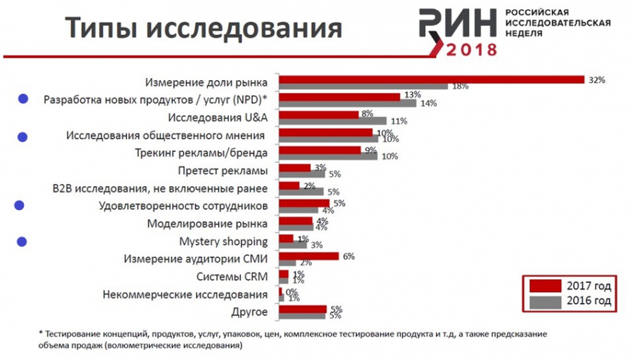 Насколько существенны ограничения и приведут ли они к существенному сокращению оборота компании? Ответить на этот вопрос могут помочь результаты индустриального опроса, проведенного исследовательскими компаниями в рамках проекта РИН (Российская исследовательская неделя) в 2018 году. На приведенной ниже диаграмме показана динамика оборотов по отдельным видам исследований за 2016−17 гг. по оценкам самих участников рынка. Направления, попавшие под запрет, обозначены нами синей точкой.