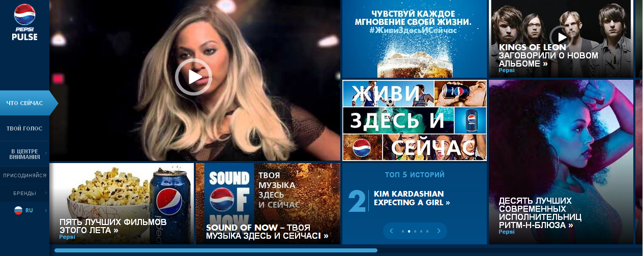В Россия появилась медиаплатформа Pepsi Pulse, созданная компанией PepsiСo. Сеть рассказывает о новостях и акциях бренда, а также выкладывает пользовательский контент из других соцсетей, посвященный Pepsi и поп-культуре. Созданный для поклонников бренда Pepsi, сайт не предназначен для общения и создания контента самими пользователями.