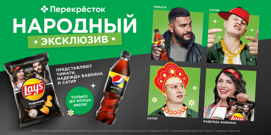Не так давно компания PepsiCo выпустила две новинки: Pepsi Манго и Lay’s «Сметана в русских традициях» с изображениями Надежды Бабкиной и Тимати. Линейка получила название «Народный эксклюзив», она представлена в нескольких сетях, в том числе — в «Перекрестке».