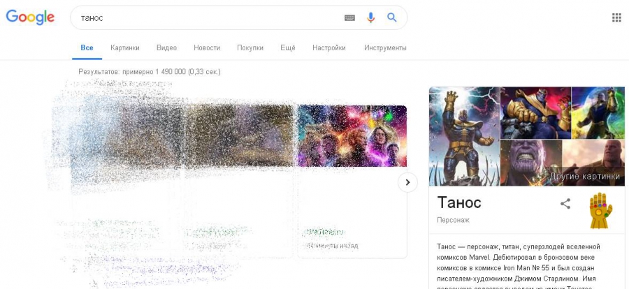 В предыдущей части «Мстителей» с помощью такой перчатки герой Marvel одним щелчком пальцев превратил в пыль половину живых существ во Вселенной. Теперь одним кликом перчатка с характерным щелчком уничтожит половину результатов выдачи. Артефакт появляется, если написать в поисковике «Танос», «Thanos», «Перчатка бесконечности» или «The Infinity Gauntlet».