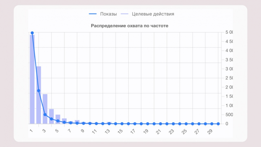Пример: для известных брендов с высоким уровнем знания и лояльности зачастую достаточно частоты 1 на качественных показах, чтобы просто проинформировать пользователей об оффере или напомнить о себе. Для брендов с более низкой базой обычно необходимо 3−4 касания для достижения наибольшего коэффициента конверсии.