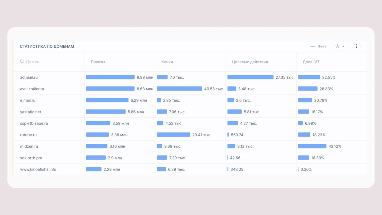 - Модель RTA Brand Safety+ обеспечивает автоматический аудит инвентаря и ежедневное обновление списков фродовых доменов. Это снизило долю некачественных показов до значений ниже рыночных бенчмарков и позволило полностью исключить «грязные» площадки.