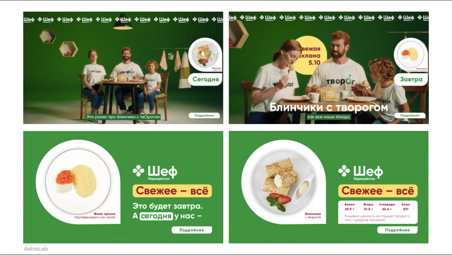 Вместе с торговой сетью «Перекрёсток» и AstraLab мы разработали интересную механику рекламной кампании: каждый день пользователю транслировался новый креатив с блюдом текущего дня и анонсом блюда следующего дня, креативы не повторялись на протяжении всего периода кампании. По итогам размещения отмечены высокие результаты по пользовательской вовлечённости, что подтверждает интерес аудитории к нестандартным рекламным механикам. Более того, высокий процент по досмотрам ролика положительно влияет на основные бренд-метрики, повышает уровень знания и осведомлённости пользователей о готовой еде «Шеф Перекрёсток».