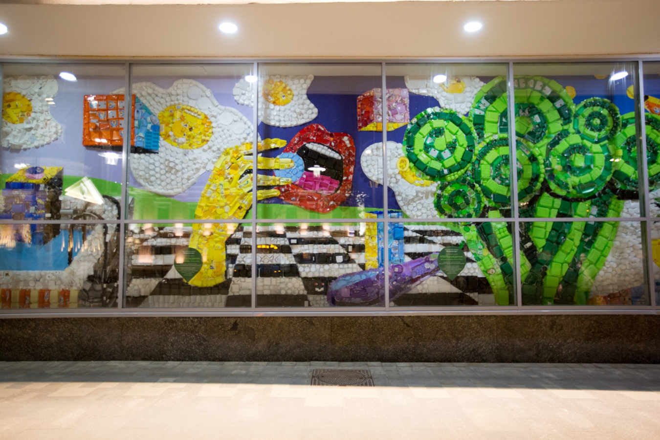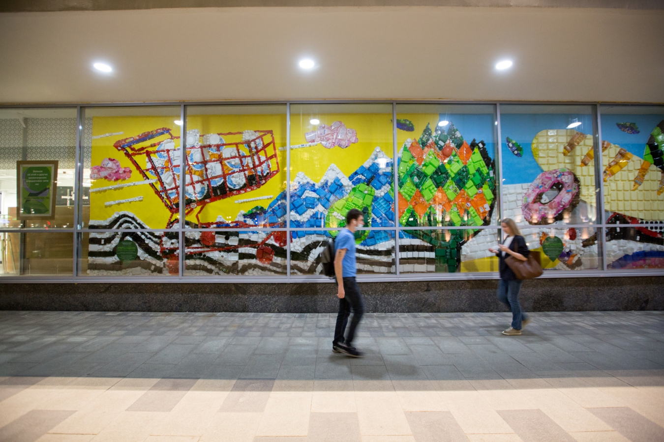 Авторы панно было перебрали около 4 тонн очищенного пластикового мусора. В инсталляции использовали более 340 кг упаковок от товаров, лотков для готовой еды, детских игрушек и других предметов. Каждый элемент художники вручную выкладывали и крепили термоклеем, а фоновые элементы прокрашивали прорезиненной краской.