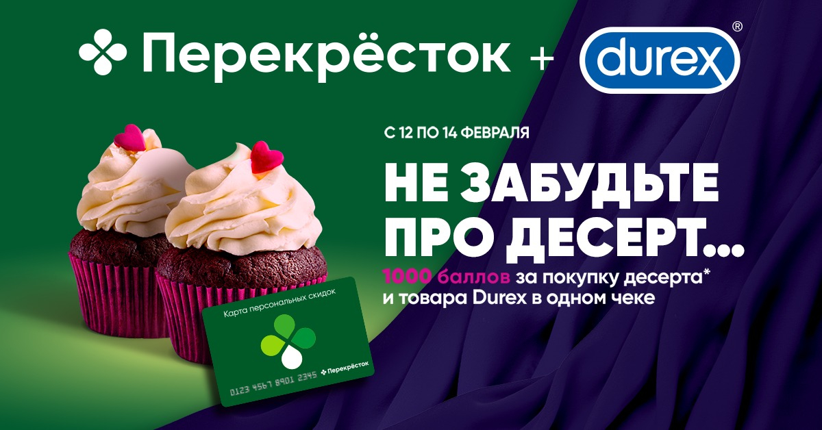 Сеть супермаркетов «Перекресток» совместно с брендом Durex запустила кампанию ко Дню святого Валентина со слоганом «Не забудьте про десерт», рассказали Sostav в пресс-службе компании. С 12 по 14 февраля все, кто купит в одном чеке продукцию Durex и товары «сладкой» категории, получат 1 тыс. баллов на карту «Перекресток».