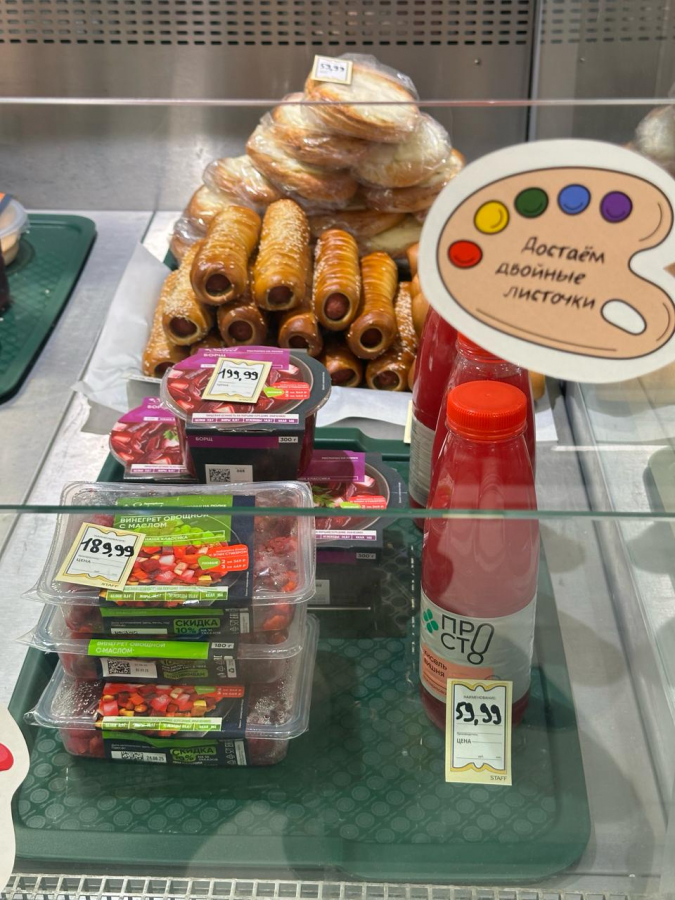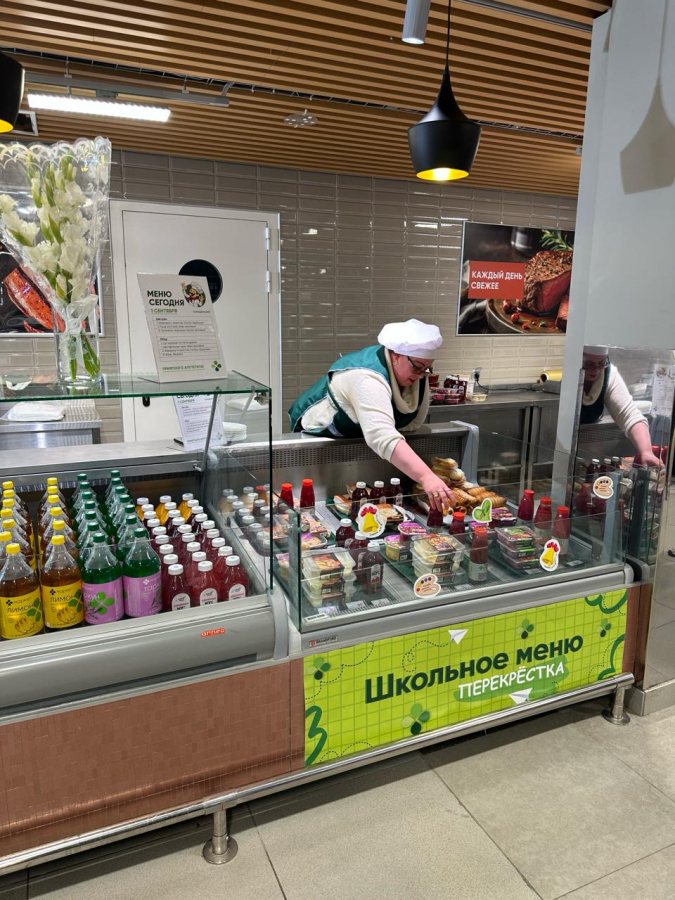 Торговая сеть «Перекресток» к 1 сентября на один день воспроизвела антураж школьной столовой в одном из своих магазинов. В торговой точке стилизовали прилавок и собрали меню готовой еды, соответствующее меню школьной столовой.