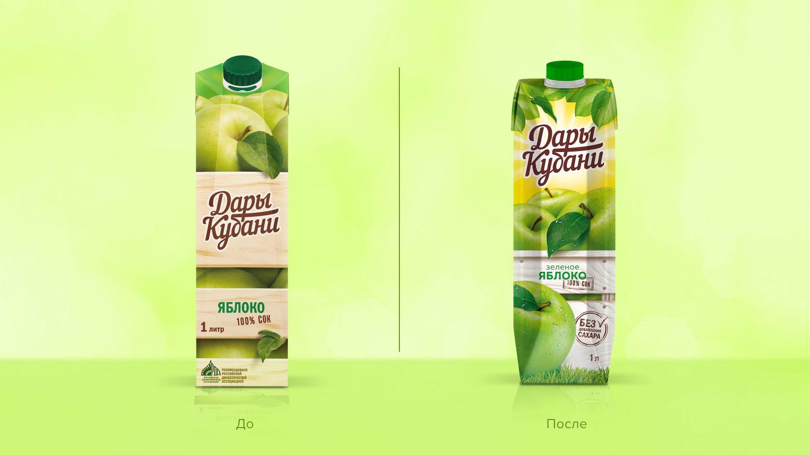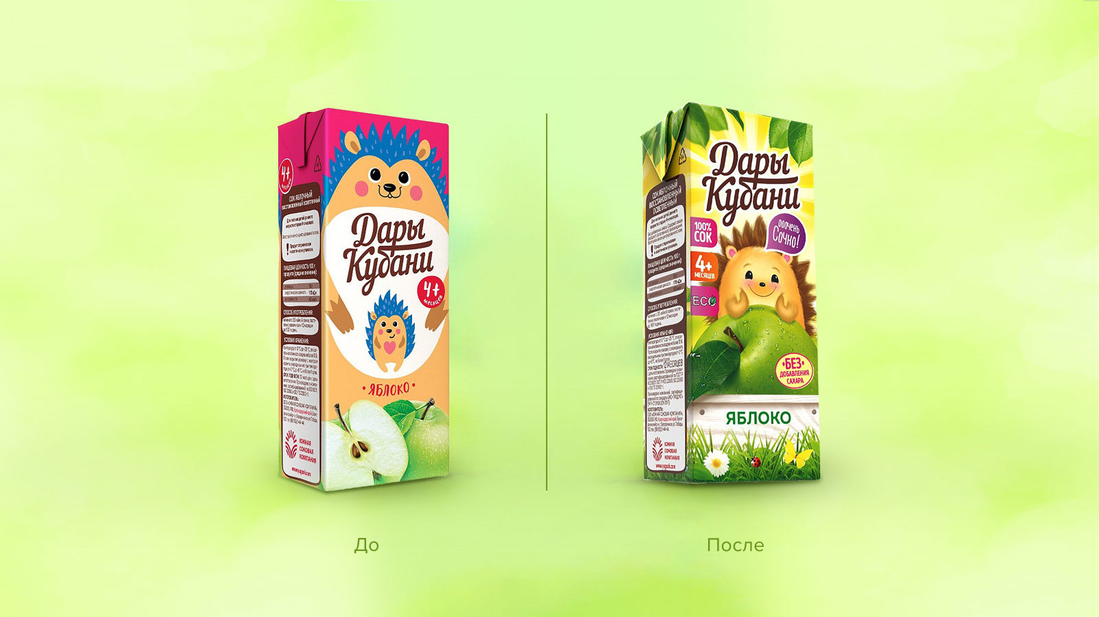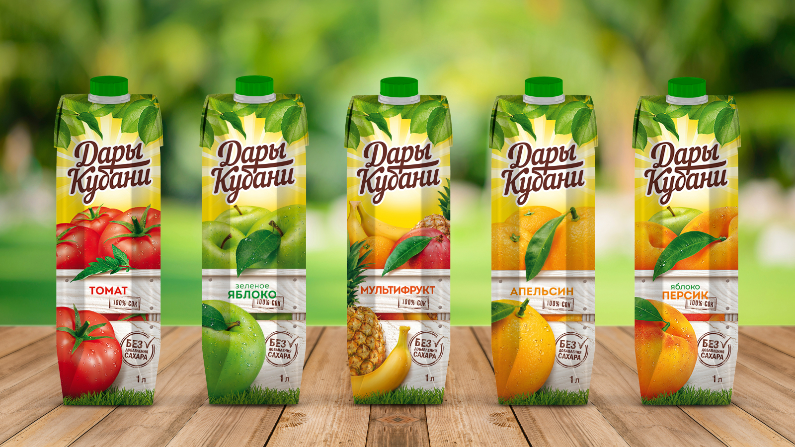 DS1 branding уже работали с компанией ЮСК: проводили редизайн соков «Дары Кубани». Новый имидж напитков выполнен в теплых зеленых оттенках. Акцент сделан на природные образы, подсвечивается натуральность и польза продуктов — основной месседж компании заказчика.