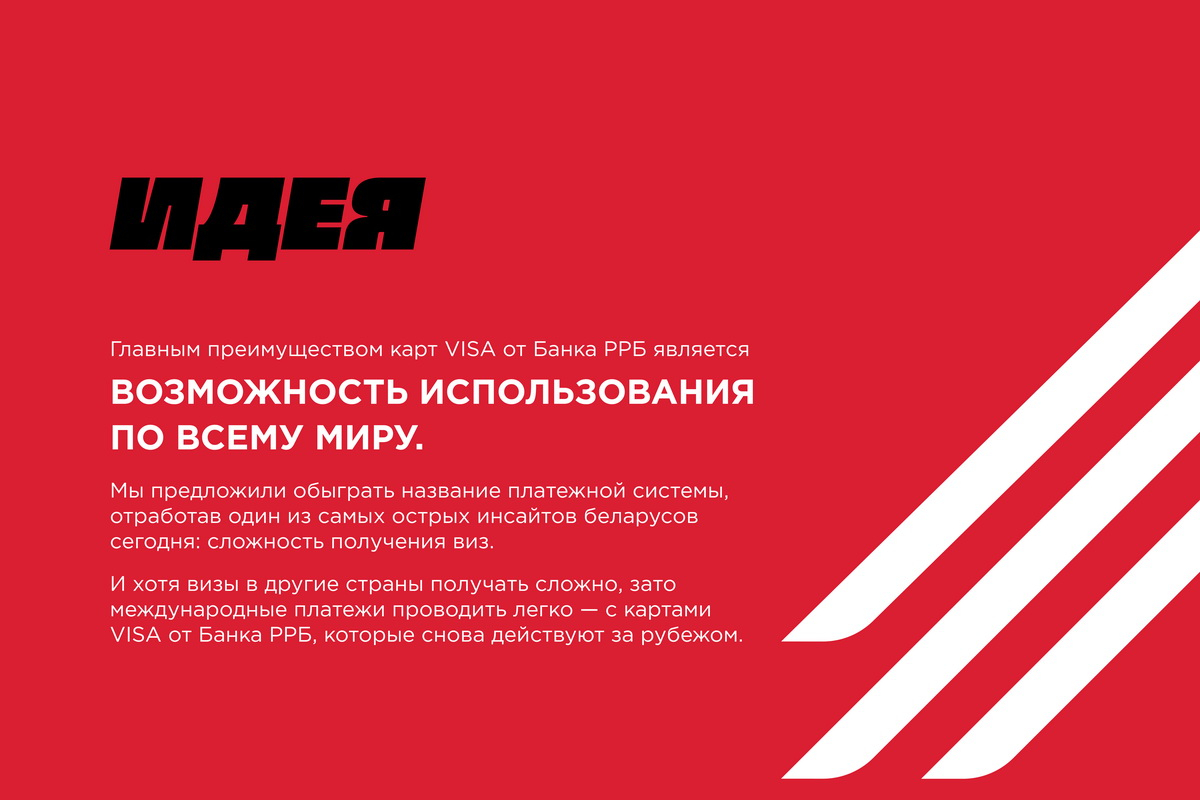 Кроме того, агентство разработало кампанию о восстановлении использования карт Visa во всех странах мира. Команда обыграла название платежной системы, отработав один из самых острых инсайтов на сегодня — технические сложности в путешествии. И хотя процесс получения виз в Беларуси все еще непростой, с платежами проблем не предвидится — карты VISA от Банка РРБ теперь снова действуют за рубежом.
