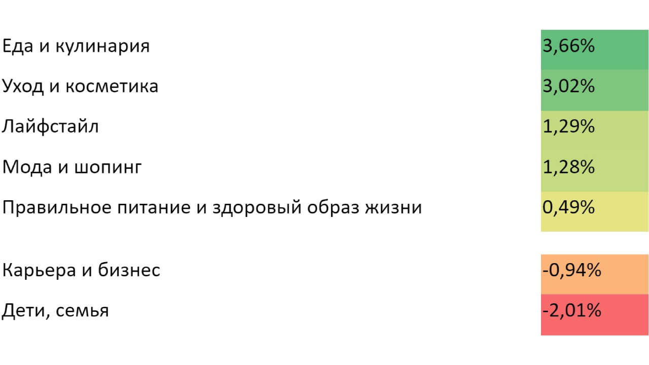 При этом блоги на темы карьера и бизнес (-0,94%), дети и семья (-2,01%) стали наименее востребованными.